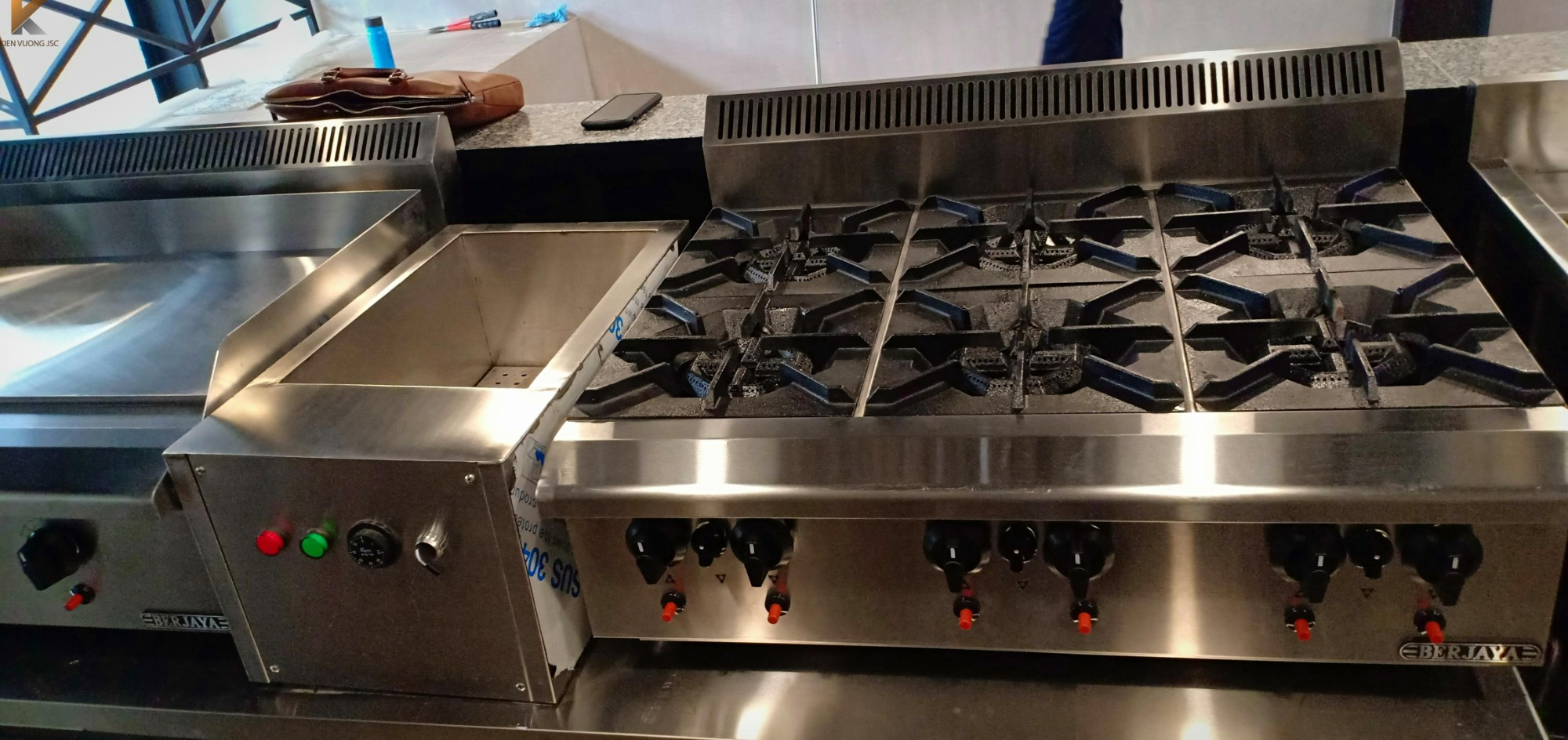 Khu bếp chính của nhà hàng với các thiết bị được sử dụng chính như: bếp á quạt thổi, bếp âu công nghiệp và các thiết bị inox chuyên dụng khác